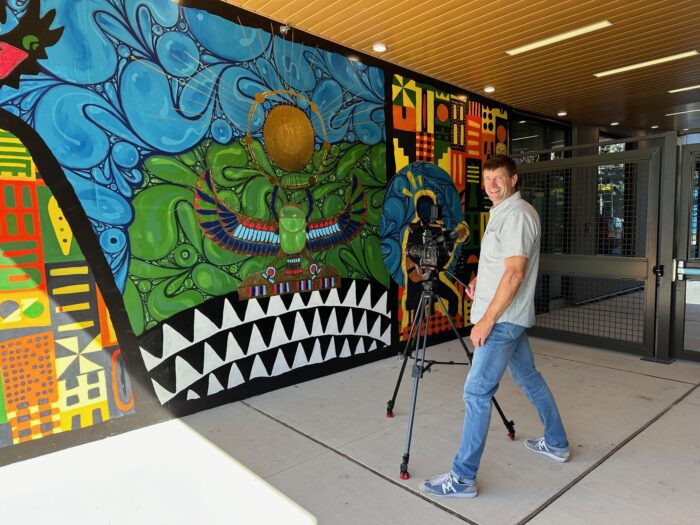 Above: Ron stands in front of one of the many stunning murals created by community artists throughout Bryant Manor in the Central District.