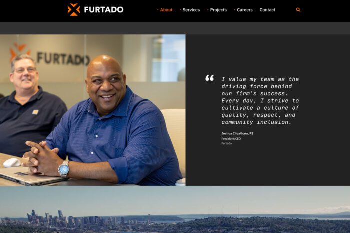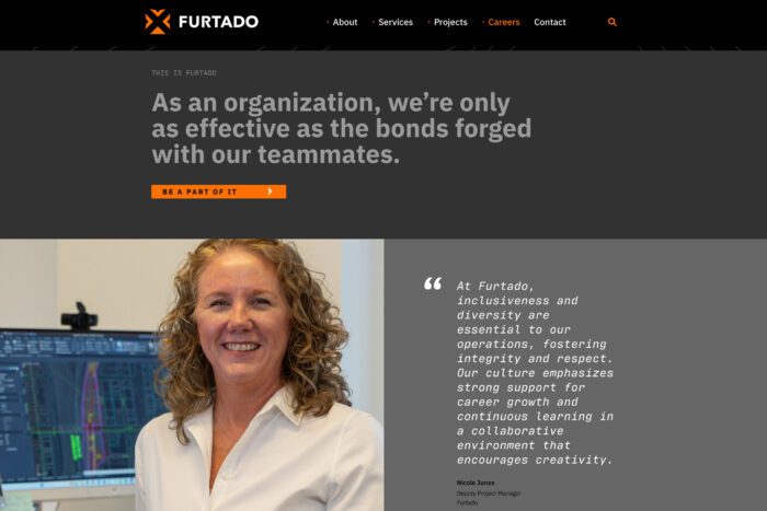 For the Furtado brand and website project, our research showed they must convey what it’s like to work there. We achieved this through a visual identity and website that reflected their values, photography to capture their team in everyday moments on jobsites, and recruitment messaging that emphasized their commitment to innovation, strong workplace culture, and bold vision for the future.